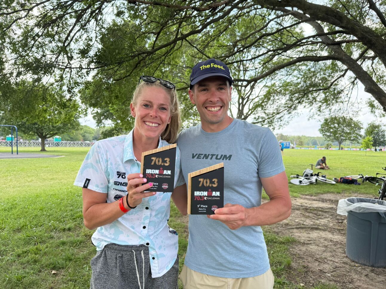 Lisa and Jackson are careful not to mix up 5th place plaques at the Eagleman awards ceremony.